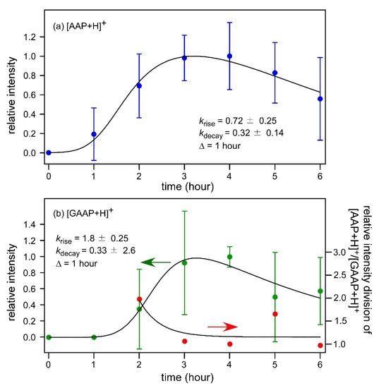 + peak, although the rise time constant for GAAP is larger than that for AAP. In fact, the time intercepts for both time profiles were determined by the fitting analysis and were 1.1 h for [AAP+H]