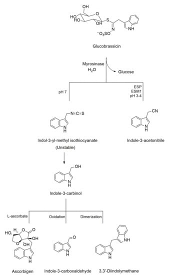 Unlike other GLS hydrolysis products, those with an indole ring are distinct because the ITCs formed at a neutral pH are unstable and ultimately undergo conversion to indol-methanols, ascorbic acid conjugates, and oligomeric mixtures [67,70,73]. When glucobrassicin is hydrolyzed (Figure 2), indole-3-acetonitrile and I3C are formed as a result of the fast reaction of the unstable isothiocyanate intermediate. The formation of indole-3-acetonitrile is promoted by the ESP protein in a way that is comparable to aliphatic GLS. Furthermore, the epithiospecifier modifier 1 gene (ESM1) [74,75] regulates indole-3-acetonitrile generation as well. Compared to indole-3-acetonitrile, I3C displays a greater chemical instability and yields products such as 3,3-diindindolylmethane, indole-3-carboxaldehyde, and ascorbigen (Figure 2) [14,73].