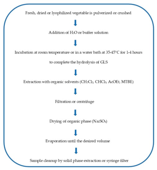 The optimum extraction conditions must be chosen carefully, given that ITCs and indoles are the products of GLS enzymatic hydrolysis. Glucosinolates have to undergo complete hydrolysis to ITCs rather than other compounds (e.g., nitriles) that exhibit a potent genotoxic risk [86]. In conventional extraction (Table 3), fresh or lyophilized samples are subjected to homogenization in a blender, with the addition of water or a buffer solution [25,87,88,89]. For Brassicaceae seeds, n-hexane is usually employed as the solvent for defatting purposes before the addition of water or a buffer. In this step, sonication for several minutes may be used [90]. To complete the hydrolysis of GLS, the mix is then allowed to autolyze at an ambient temperature or is subjected to incubation in a water bath at 35–45°C for 1–4 h. A buffer solution is typically added instead of deionized water because it affords a constant neutral pH that is required to ensure that GLS hydrolysis yields ITCs [25,87,91,92]. Nevertheless, it has been argued that for SFN, water with a pH of 3–6 should be added to attain the maximum amount of this compound when glucoraphanin is hydrolyzed [19,93]. Once hydrolysis is completed, a suitable solvent is used for the extraction of ITCs and indoles. At this step, derivatization may be also applied [25,87,94]. Table 3 lists the organic solvents necessary for standard ITC and indole extraction, with the chlorinated solvents dichloromethane (CH2Cl2) [42,43,78,93,95,96,97] and chloroform (CHCl3) [90] being preferred. Nevertheless, other solvents have been also proposed such as ethyl acetate (AcOEt) [98] acetone [96,99], and methyl t-butyl ether (MTBE) [19,96]. The general procedure is briefly described in Figure 3.