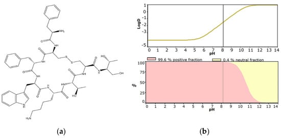 Octreotide consists of an eight-amino-acid chain, NH-D-Phe-Cys(1)-Phe-D-Trp-Lys-Thr-Cys(1)-Thr-ol, as shown in Figure 1a. The LogD values and the ionization fraction of octreotide, as a function of pH, were calculated by the ADME boxes software, ver. 3.0.3, build 45, Pharma Algorithms Ltd., and the results are presented in Figure 1b.