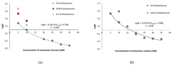 As shown in Figure 2, an increase in the concentration of the ammonium formate (Figure 2a) and ammonium acetate (Figure 2b) decreased the retention of octreotide. At the pH values tested, the residual silanols of the stationary phase were negatively charged. Therefore, an increase in the concentration of the buffering salt in the mobile phase decreased the electrostatic attractions between the negatively charged residual silanols of the stationary phase and the positively charged molecules of the analyte. To improve the peak symmetry, a proportion of diethylamine was added at 5 mM and 10 mM of ammonium formate (Figure 2a) and at 10 mM of ammonium acetate (Figure 2b). It was then observed that, through the addition of diethylamine, the retention of octreotide was increased with concomitant improvements in the peak symmetry.