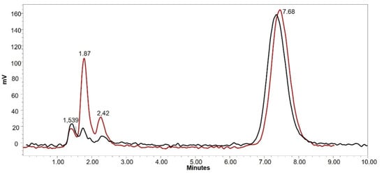 According to the above studies, a mobile phase consisting of ammonium bicarbonate 8.6 mM (pH 8.1)/acetonitrile 35/65 (v/v) was chosen as the optimum. The selectivity of the proposed HILIC-FL method is illustrated in Figure 4, where it is depicted that a chromatogram obtained from the analysis of the octreotide quality control sample at 1 μg mL−1 (black line) was superimposed to a chromatogram obtained from the analysis of the octreotide injection form (red line). Under the optimum chromatographic conditions, octreotide was eluted at 7.7 min. The high sensitivity and selectivity of the fluorescence detection, with the excitation wavelength (λexcitation) set at 280 nm and the emission wavelength set at (λemission) 330 nm, enabled a simple sample preparation procedure that included only dilution steps.