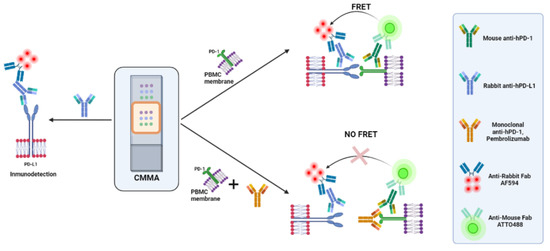Two types of assays were performed. On the left, quantification of PD-L1 protein expression by IF. On the right, two types of FRET assay were performed for the quantification of PD-1/PD-L1 in the absence (upper) and presence (bottom) of a saturating concentration of the blocking antibody, pembrolizumab. Only one CMMA is represented as an example; each slide had two CMMAs printed. Created with BioRender.com.