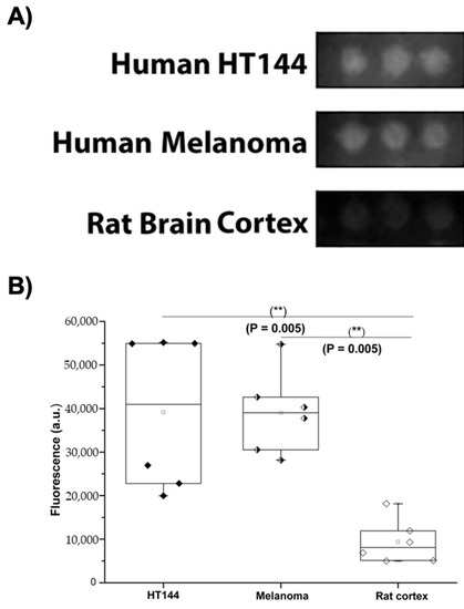 Human PD-L1 expression was assessed in the samples immobilized in the CMMAs, using an anti-hPD-L1 IgG labeled with a fluorescent secondary antibody, and the signal intensity was quantified. A high specific binding for anti-PD-L1 was observed in HT144 cells and melanoma samples, whereas it did not exceed nonspecific binding in rat cerebral cortex tissue (Figure 2).