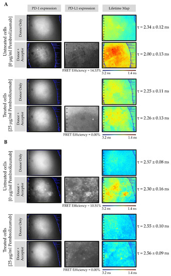 Figure 3A shows the PD-1/PD-L1 interaction in CMMAs from the HT144 melanoma cell line incubated with PBMC membranes in the presence and absence of pembrolizumab. The FLIM images consist of pseudo-color lifetime maps, where blue indicates a higher lifetime (3.2 ns) and red indicates a lower lifetime (1.4 ns). The grayscale intensity maps demonstrate the expression of PD-1 (donor) and PD-L1 (acceptor). In the absence of pembrolizumab, the lifetime decreased from 2.34 ± 0.12 ns to 2.00 ± 0.13 ns, resulting in a FRET efficiency of 14.53% (Figure 3A, upper panel). However, in the presence of 25 μg/mL pembrolizumab, no reduction in donor lifetime in the presence of the acceptor was observed, yielding a FRET efficiency of 0% (Figure 3A, bottom panel). The same experiment was carried out using melanoma tissue membrane microarrays incubated with PBMC membranes in the presence and absence of pembrolizumab (Figure 3B). Here, in the absence of the blocking drug, donor lifetime decreased from 2.57 ± 0.08 ns to 2.30 ± 0.16 ns, resulting in a FRET efficiency of 10.51% (Figure 3B, upper panel). Contrastingly, in CMMAs treated with pembrolizumab, no change in the donor lifetime in the presence of the acceptor occurred, resulting in a FRET efficiency of 0% (Figure 3B, bottom panel). No interactions occurred when CMMAs were not incubated with PBMCs; therefore, FRET signals in all the conditions tested were 0%. These results indicate that the decreases in donor lifetimes, reflected by the high FRET efficiency values, were due to the specific interactions of PD-1 expressed in PBMCs and PD-L1 present in CMMAs. In both cases (Figure 3A,B), intensity maps confirmed the presence of the donor, PD-1, and acceptor, PD-L1. These findings suggest that PD-1/PD-L1 interactions can be quantified by the assay developed using iFRET. Notably, when the blocking drug, pembrolizumab, is present, this receptor/ligand interaction is disrupted, and FRET does not occur.
