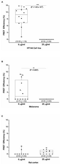 Three replicates per sample type were analyzed in the presence and absence of pembrolizumab, and the mean FRET efficiency for each sample type was calculated. Box-and-whisker plots were created for all CMMA cores assessed, and the FRET efficiencies obtained were significantly higher in the absence of pembrolizumab with mean values of 10.05% ± 1.19% and 3.74% ± 1.33% for HT144 and melanoma samples, respectively (Figure 4A,B). In the presence of pembrolizumab, PD-1/PD-L1 interactions were abolished, and, therefore, all FRET efficiencies were 0% in both sample types. Mann–Whitney U analysis was performed to determine statistical differences between pembrolizumab-treated and untreated CMMAs (statistical differences are indicated with p-values ≤ 0.05). FRET efficiency values were significantly higher in the absence of blocking antibody for HT144 (*** p = 1.03 × 10−5) and melanoma (** p = 0.007) compared to CMMAs treated with 25 μg/mL of the blocking drug. The rat cerebral cortex CMMA was used as a negative control; therefore, no significant differences were detected between the treated and untreated samples, with mean FRET efficiencies of 0.60% ± 0.42% and 0.92% ± 0.28% in the absence and presence of pembrolizumab, respectively (Figure 4C). These results demonstrate that the iFRET assay, using a CMMA model system incubated with PBMCs, is able to quantify the PD-1/PD-L1 interactions at distances of 1–10 nm. The ranges of FRET efficiency values obtained here are similar to previous results using cell cultures and melanoma patient samples [11].