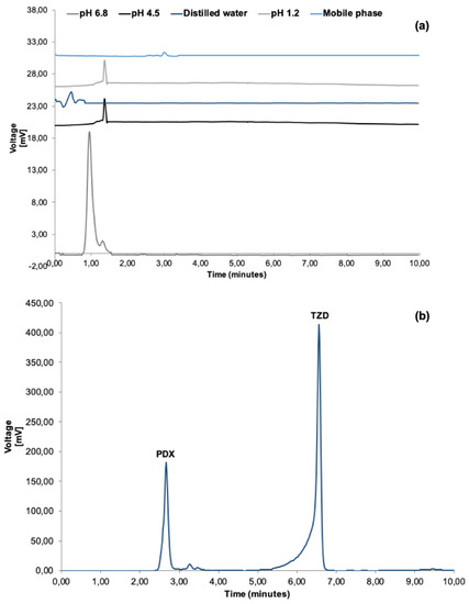 First, the respective peak of each compound was identified through the analysis of samples, containing only one compound at a time. Subsequently, TZD and PDX were combined, and these solutions were analyzed to ascertain whether a shift in retention time could be identified or whether there was any other peak interference due to the combination. Further to this, the specificity of both compounds was studied when combined with typical pharmaceutical dissolution media. Different solvents, namely hydrochloric acid (pH 1.2), buffered distilled water (pH 4.5 and pH 6.8), and pure distilled water, were injected separately to ascertain whether any peak interference would occur once TZD and PDX were diluted in these solvents.