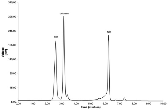 During solution stability testing, it became apparent that this method was sensitive to the detection of degradation products associated with the two drug compounds. Table 6 provides a summary of the quantified concentrations of both compounds during exposure to various storage conditions as well as to conditions that would accelerate the degradation of both drugs. It was observed that both PDX and TZD showed stability when stored in the fridge (5 °C). In terms of stability at ambient storage conditions, it was found that PDX degraded ≈10% during the 48 h testing period, while TZD remained stable at room temperature. The sample stored at 60 °C showed a 65% decrease in PDX purity after the first 24 h of storage and complete degradation thereafter. The appearance of an unknown peak was also observed at 3.13 min (Figure 4). This observation is contradictory to the stability data reported in literature, which states that PDX remains stable during exposure to heat [16,17]. However, it should be noted that this stability was not tested in solution, neither in this specific solvent system nor in combination with TZD. Quantification of TZD in the sample stored at 60 °C showed an increase in the drug concentration, and this could be ascribed to possible solvent evaporation. TZD completely degraded upon exposure to 60 °C in combination with PDX during the 48 h testing period. PDX is reported to be sensitive to light when it is in neutral or alkaline solutions [16,17]. This behavior was confirmed during this validation process, since PDX was extensively degraded during exposure to sunlight when combined with TZD (Figure 5), with no possibility of identifying the peaks associated with PDX or TZD. The same behavior was observed for TZD, and this was noted to be different to that reported by Gandhi, Shevale, and Choudhari [10]. The stability of both compounds was observed when exposed to acidic conditions. Following these findings, which are different from those dictated by the literature that were observed in terms of the stability of PDX in strong alkali. PDX showed marked degradation (% purity loss of 35%) across the solution stability testing period in an alkaline environment (Table 6). It was also noticed that PDX is sensitive towards oxidative species, based on a purity loss of 20% across a period of 48 h. On the other hand, TZD remained stable during exposure to an alkaline environment as well as to oxidative species.