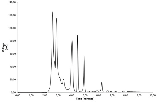 The method development and validation were performed using a Knauer Azura DAD (Berlin, Germany) HPLC system equipped with an autosampler, quaternary pump, photodiode array detector, and column thermostat. The ClarityChrom® software package was used for data processing purposes. A Supelco™ (Bellefonte, PA, USA) Discovery® C18, 150 × 4.6 mm, 5 μm, was used as the column and was purchased from Sigma-Aldrich (Johannesburg, South Africa). Throughout the method validation process, the column temperature was maintained at ambient temperature. An isocratic flow of the mobile phase was utilized, with the mobile phase consisting of 30:70 v/v acetonitrile:HPLC grade water and with 1 mL of glacial acetic acid added to the mixture of acetonitrile:water. The following mobile phase flow rate program was utilized: 0.5 mL/min from 0 to 4 min, followed by an increase of the flow rate to 1.5 mL/min from 4.1 min to 8 min. An injection volume of 10 μL and a detection wavelength of 260 nm were used. A run time of 8 min was employed.