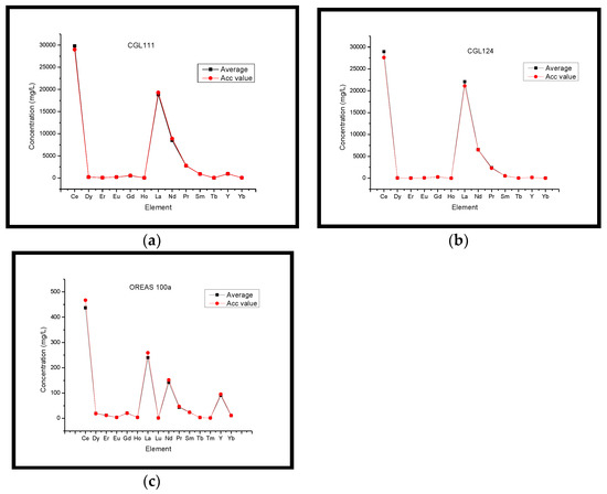 Evaluation of the method’s performance in the REE determination: (a) CGL 111; (b) CGL 124; (c) OREAS 100a.