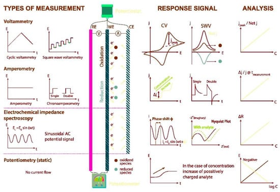 The classification of chemical sensors can be performed according to different aspects. A summary classification, for example, can be based on the type of analyte for which the sensor is used. Therefore, there are sensors for measuring pH, sensors for analyzing metal ions, and sensors for detecting oxygen or other gases [4]. Of course, these are just some examples. Another type of discrimination can be performed on the basis of the type of signal transduction, which depends on the analytical technique used [9]. Figure 1 illustrates some subgroups of electrochemical devices [10].