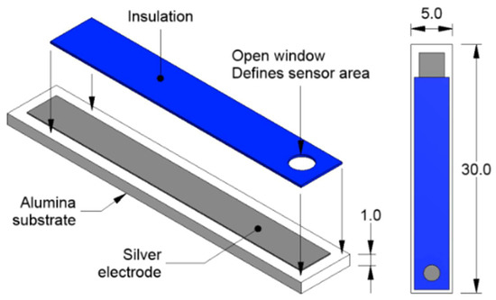 Other techniques for producing potentiometric sensors are electrodes with thin-film technology or with thick-film technology (screen printing) [15,16] (Figure 2). Hybrid sensors have also been designed with electrodes with screen printing or thin-film technology and the MOSFET amplification component. For example, a potentiometric sensor for pH measurement has been studied thanks to electrodes built with screen-printing technology. The RuO2/TiO2 indicator electrode and the Ag/AgCl/KCl reference electrode were printed on an aluminum substrate [17].