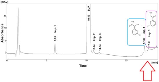 Chromatogram corresponding to a standard solution containing 400 μg/mL BUP spiked with all impurities at their specification limits. The red arrow depicts the chromatographic area and the related impurities with their structures of the process described herein.