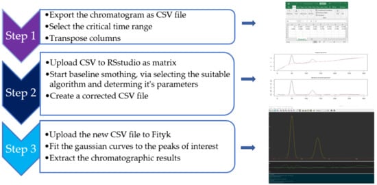 The baseline corrected CSV files of each chromatogram were transferred from RStudio to Fityk software for further processing. Fityk is a program for the nonlinear fitting of analytical functions, which enables the extraction of the area of the peaks of interest. In detail, each CSV file was imported to the software, and the chromatogram could be viewed at the main plot of the GUI. After selecting “gaussian” from the list of functions and choosing “auto-add”, the peaks of interest were bolded, as depicted in Figure 4. In addition, the selection of “star fitting” enables the accomplishment of the minimization of the error between the experimental data and the fitted curve. Critical information about the integrated peaks are presented in the GUI sidebar, such as the areas, which were collected and submitted to further processing, in order to figure out if the validation characteristics, i.e., linearity and accuracy, were fullfiled.