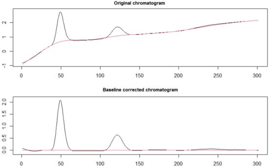 Original chromatogram and baseline corrected chromatogram after applying the ALS algorithm from the “baseline” package in RStudio.