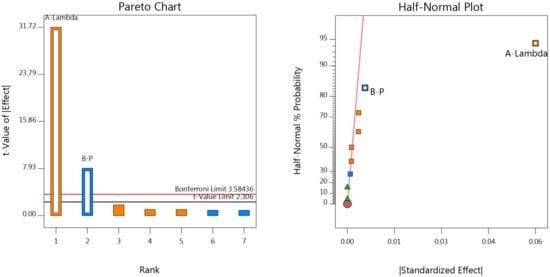 The statistical significance of factors effects on the responses was further assessed through the graphical interpretation of the experimental results. Both half-normal probability plots and Pareto charts [13,14,15] revealed the significant effects for each response and as presented in Figure 5 for AIMP5_LOQ and AIMP4_SL. Factor A (lamda parameter) proved to have a significant effect in all responses, while Factor B (p parameter) was found to be significant in the 3 out of 4 responses, with the exception of AIMP4_LOQ. The outcome regarding these 2 factors was somehow expected, as these parameters constitute the ‘nucleus’ of the procedure and are considered crucial for its performance. Therefore, many trials in various areas should be conducted prior to their application in order to select the most suitable values, and these values should be strictly kept throughout the assay. For contrast, as literature survey revealed, in the single study implementing ALS for baseline correction on chromatographic data [5], the ALS algorithm was affected only by factor p. Concerning factor C (time range), the results show that it had no impact on any response.