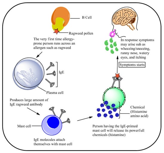 It takes minutes to days of alerting exposure to the mast cells and basophils for them to become primed immunoglobulin E antibodies. Protein molecules are attached to a ragweed pollen particle that has been inhaled; the same symptoms occur, as shown in Figure 2. Furthermore, IgE antibodies jump to the outsides of basophils, and then mast cells are acquainted with the protein surface signs of the allergen. In addition to this, IgE antibodies react to the protein surface markers by binding, and the rest of the IgE antibodies are close to the basophils or mast cells [28,29].