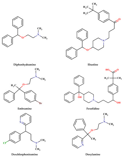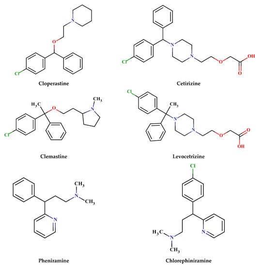 Cetirizine, pheniramine, chlorpheniramine, clemastine, levocetirizine, fexofenadine, embramine, dexchlorpheniramine, doxylamine, meclizine, buclizine, and cloperastine, shown in Figure 3.