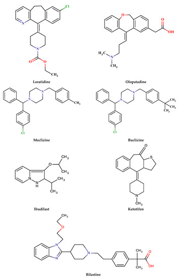 Loratidine, olopatadine, ketotifen, diphenhydramine, loratadine, domperidone, ebastine, ibudilast, bilastine, azelastine, etc., shown in Figure 3.