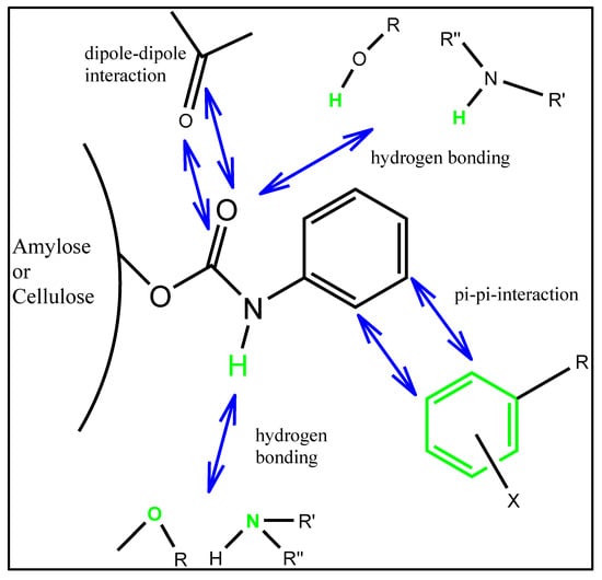 Chiral separation can be achieved using various chiral selectors such as polysaccharides, cyclodextrins, antibiotics, proteins, macrocyclic glycopeptides, crown ethers, ligand exchangers, Pirkle’s types, etc., but among them, polysaccharide-centered chiral selectors are the top choice of analysts and scientists. Chiral columns such as Chiralpak AD and AmyCoat are both composed of amylose, whose structure is more helical in comparison to cellulose, etc. [65]. The best separation using such a chiral column is achieved because of the existence of chiral grooves inside. In addition to this, the spectroscopic fitting of enantiomers of chiral drugs occurs at different retention intervals. The exact fittings of the drug enantiomers occur because of the interaction of various forces such as hydrogen bonding, π-π interactions, steric effects, van der Waal’s forces, etc. (Figure 4). It is the mobile phase that tends to carry out the drug enantiomers together. Therefore, after the struggle between mobile and stationary phases, the weak bonding enantiomer eluted first, as compared to the strongly bonding enantiomer.