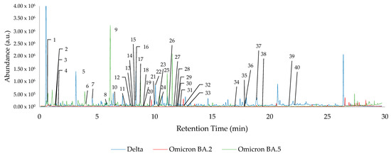 A total of 40 key features of interest were tracked using retention time alignment and peak matching across the dataset. Of these 40 features, the following 14 compounds were identified: (#5) Diacetone alcohol (3.109 min, CAS#123-42-2), (#6) Styrene (4.033 min, CAS#100-42-5), (#10) 2-Pentylfuran (6.577 min, CAS#3777-69-3), (#12) Phenylacetaldehyde (7.897 min, CAS#122-78-1), (#20) Undecane (9.552 min, CAS#1120-21-4), (#24) Methyl caprylate (10.366 min, CAS#111-11-5), (#26) trans-2-Nonenal (11.235 min, CAS#18829-56-6), (#27) 1-Nonanol (11.679 min, CAS#143-08-7), (#32) Decanal (12.561 min, CAS#112-31-2), (#33) 2-Phenoxyethanol (12.836 min, CAS#122-99-6), (#35) Dodecanal (17.798 min, CAS#112-54-9), (#37) 6,10-Dimethyl-5,9-undecadien-2-one-(E) (18.841 min, CAS#689-67-8), (#38) 1-Dodecanol (19.366 min, CAS#112-53-8), and (#39) Dodecanoic acid (21.668 min, CAS#143-07-7). The locations of all 40 features of interest are highlighted in Figure 1, which demonstrates overlayed chromatograms corresponding to the hand odor of one patient from each of the Delta, Omicron BA.2, and Omicron BA.5 datasets. Each feature of interest is not present in each sample, and, as such, is not present in each chromatogram in Figure 1. The average trend of these features of interest across each dataset is graphically represented in Figure A1. The absence, or reduced presence, of some of the features across the datasets are graphically displayed using the log-10 transformed average peak areas of the 40 features of interest, separated by each variant.