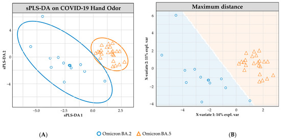 sPLS-DA model for COVID-19 hand odor samples: (+) Omicron BA.2 vs. (+) Omicron BA.5. (A) Individual sample plot; ellipses = 95.0% CI. (B) Individual sample plot, background delineates class assignment.