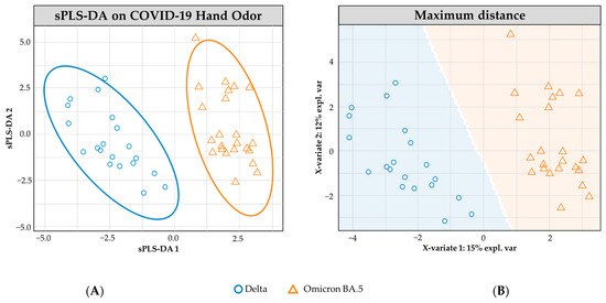 sPLS-DA model for COVID-19 hand odor samples: (+) Delta vs. (+) Omicron BA.5. (A) Individual sample plot; ellipses= 95.0% CI. (B) Individual sample plot, background delineates class assignment.