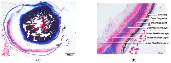 Masson’s trichrome (methyl blue) stains of wildtype mouse ocular tissue; (a) 20× view of the whole ocular tissue section and (b) 4× view of the retinal microanatomy. Rho−/− mouse ocular tissue; (c) 20× view of the whole ocular tissue section and (d) 4× view of the degraded retinal microanatomy.