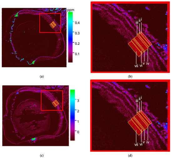 (a) Distribution of 63Cu in WT mouse ocular tissue, with each region of interest (ROI) within the retinal layers highlighted (red). (b) A zoomed view with the portions (i) choriocapillaris (CC), (ii) outer segments (OS), (iii) inner segments (IS), (iv) outer nuclear layer (ONL), (v) outer plexiform layer (OPL), (vi) inner nuclear layers (INL), and (vii) inner plexiform layer (IPL). (c) Distribution of 66Zn in WT mouse ocular tissue, with each region of interest (ROI) within the retinal layers highlighted (red). (d) A zoomed view with the portions (i) CC, (ii) OS, (iii) IS, (iv) ONL, (v) OPL, (vi) INL, and (vii) IPL.