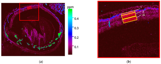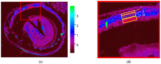 (a) Distribution of 63Cu in Rho−/− mouse ocular tissue, with each region of interest (ROI) within the retinal layers highlighted (red). (b) A zoomed view with the portions (i) choriocapillaris (CC), (ii) inner nuclear layer (INL), (iii) inner plexiform layer (IPL), (c) Distribution of 66Zn in Rho−/− mouse ocular tissue, with each region of interest (ROI) within the retinal layers highlighted (red). (d) A zoomed view with the portions (i) CC, (ii) INL, and (iii) IPL.
