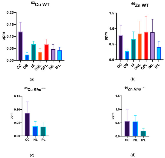 (a) Concentration values (ppm) of copper within a WT ocular tissue. (b) Concentration values (ppm) of Zn in a WT ocular tissue. (c) Concentration values (ppm) of copper within a Rho−/− ocular tissue. (d) Concentration values (ppm) of Zn in a Rho−/− ocular tissue.