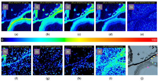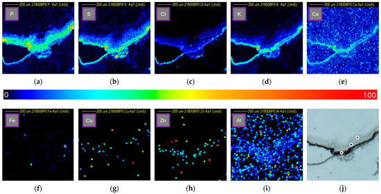 PIXE has an inferior limit of detection (ppm range) than ICP-MS, which regularly detects elements in the ppb range [16,36,37]. As a result, the copper observed in the tissue by ICP (~1.5 ppm) is at the lower end of PIXE detection limits, which were ~10 ppm across the 1 mm2 analysed. In Figure 5g and Figure 6g, the images can be seen to be sparsely populated by data points as a result.