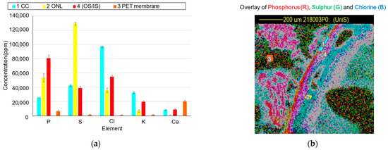 Quantitative PIXE data exhibiting the concentrations of the elements phosphorus, sulfur, chlorine, potassium, and calcium. (a) Concentrations (ppm) of the regions of interest (ROI) within a wildtype (WT) tissue. (b) An image of the corresponding WT tissue section ROIs; (1) choriocapillaris (CC) (2) outer nuclear layer (ONL) (3) polyethylene terephthalate (PET) (4) outer/inner segment (OS/IS).