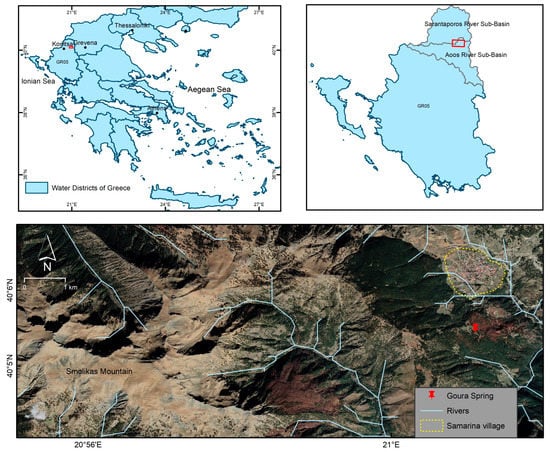 In the framework of the preparation of the River Basin Management Plans of Greece (Special Secretariat for Water—Ministry of the Environment and Energy of Greece), a wide range of geospatial data sets have been produced which are freely distributed and can be downloaded from the corresponding geoportal [40]. According to these datasets that have been incorporated and studied in a Geographic Information System, the broader area of Samarina is located in the northern-western part of the Aoos river sub-basin (Figure 1), belonging to the water district of Epirus (GR05).