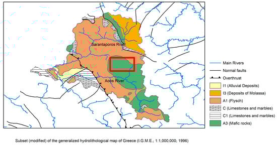 The water district of Epirus has an area of about 10,000 km2 and is situated in the part of the country with the highest precipitation. From a geotectonic point of view, the area belongs to the Olonos-Pindos zone [41] and shows great sedimentation alternations such as carbonate, siliceous, and clastic formations. Its main characteristic is the Ophiolitic masses mainly consisting of ultramafic rocks such as peridotites and serpentinites and often accompanied by red cherts. Ophiolites are found tectonically displaced on the Tertiary flysch of the Pindos and they constitute a complicated petrological and geological unit which is extended widely in the mountainous area among Metsovo, Panagia, Vovoussa, Avdela, Samarina and Smolikas Mountain [42]. Figure 2 presents the hydrolithological formations in the broader area of the Aoos and Sarantaporos River Basins. Formations encoded as A1 and A3 correspond to the Flysch of Pindos and Ophiolite masses, respectively. Hydrogeologically, they both represent as a whole impermeable medium, with the possibility of forming smaller aquifers and springs within cracked sandstones or carbonate inlays, or on their top and most weathered layer, especially on areas of extended plant growth. C and C1 are the karst formations of the area. In particular, C corresponds to limestones and marbles with extended appearance and medium to high water permeability, while C1 are similar formations with limited appearance and fluctuating water permeability. Lastly, I1 and I3 are porous mediums, with I1 referring to alluvial deposits of fluctuating water permeability and I3 to deposits of molasse (marls, sandstones, and conglomerates) of rather low water permeability. Samarina water is a water originating from precipitation (snow and rain) that infiltrates into ground and gushes at the respective Goura spring. In fact, the dissolution of the ophiolites and relative mafic rock formations that are rich in Mg could justify that the Samarina water is a Mg-HCO3 hydrochemical type, dominated by HCO3− (106 mg/L) and Mg2+ (22.3 mg/L) and less by Ca2+ (2.4 mg/L), originated by the dissolution of carbonate formations. This is also confirmed by the ion ratio Mg2+/Ca2+ = 15.3 [43].