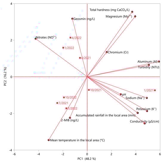 A principal component analysis (PCA) was conducted to simplify the analysis of multiple variable data and enhance the clarity of the results. The parameters were used to investigate whether any correlation with climate conditions, mainly accumulated rainfall and mean temperature of the local area, was observed. The selection of two principal components, as depicted in Figure 3, was based on their eigenvalues > 1, which collectively represented 64.4% of the variance. The results show that PC1 exhibited a positive correlation with total hardness, turbidity, and various concentrations of organic and inorganic compounds such as geosmin, magnesium cations, aluminum, chromium, and nitrates. On the contrary, a negative correlation was observed between PC1 and pH and conductivity values, potassium, and sodium cations, 2-MIB concentration, and climate data such as accumulated rainfall and mean temperature in the local area. PC1 accounted for 48.2% of the variance. PC2 accounted for 16.2% of the variance, respectively. Strong positive and negative correlations (>0.90) were observed in the parameters illustrated in Figure 3, and in combination with statistically significant (p < 0.05) results were examined. It was observed that the average temperature exhibited a strong negative correlation with the concentration of magnesium cations. As previously mentioned, the salts of divalent cations, such as calcium and magnesium, are characterized by a prevalence of bitter and salty tastes [30]. The concentration of these cations exhibits an inverse correlation with the temperature of the region, thereby rendering the water terroir directly responsive to the temperature of the area. Additionally, a good positive correlation (>0.7) with statistically significant differences (p < 0.05) was observed between accumulated rainfall and the concentration of potassium cations. Despite lacking a direct impact on taste, potassium cations may facilitate an indirect influence by enhancing the activity of taste buds, even at concentrations commonly present in drinking water. Potassium cations have an essential role as an ion in facilitating communication among nerve cells, as noted by Matsuo et al. [76].