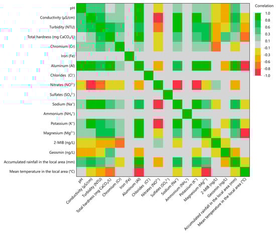 A multivariate correlation analysis (MCA) was also performed to further clarify the correlation of the studied parameters with climate conditions and the results are illustrated in Figure 4. In this color map, the color scale has correlation values from −1 to 1. The more intense the green color, the higher the positive correlation between the parameters. On the other hand, a more intense red color suggests higher negative correlation between the parameters. Iron, chlorides, sulfates, and ammonium cations did not show a correlation with any parameter. Nitrate concentration showed a strong negative correlation with both potassium and sodium cations concentration. Aluminum seemed to have strong correlation (>0.9) with many parameters, but it was measured only in three water samples, rendering the observation statistically insignificant (p > 0.05). The off-odor compounds 2-MIB and geosmin barely had any good correlation (>0.7) with other parameters. It was only observed that 2-MIB had a good negative correlation (>0.7) with chromium concentration. Mean temperature also had a good negative correlation with the average temperature in the local area. No other significant correlation of the climate conditions with any parameter was observed.