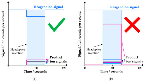 The analyst’s task with new diluent solvents is not complete upon determination of the upper limit at which the solvent can be used (in water) for headspace-SIFT-MS analysis. The impact of the diluent on specificity must be assessed. Although this can be determined to some extent based on reaction chemistry contained in the SIFT-MS library [42] (see the workflow in Section 4.4), experimental verification of specificity is essential for several reasons: