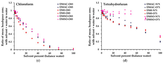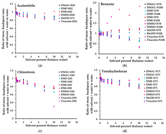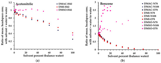 High-sensitivity headspace analysis relies in part on effective partitioning of analyte into the headspace from the condensed phase [38] (pp. 18−35). This partitioning is influenced by the relative properties of the analyte and the matrix. For trace analysis of solutions, the matrix approximates the solvent (or solvent mixture). This work evaluated moving from utilization of highly polar aqueous-only systems that favor partitioning of non-polar volatiles into the headspace (and hence their lower concentrations in Mix 1) to systems of lower polarity through use of an organic diluent (with poorer partitioning of non-polar compounds). This behavior is evident in Figure 4, where the drastic reduction in measured benzene and chloroform at moderate to high proportions of DMI prompted the creation of Mix 2—with higher concentrations of non-polar analytes—to better evaluate method performance under these conditions. Interestingly, more polar analytes did not show the opposite behavior; for several, there was a modest increase in headspace response (methanol, in particular), but in most cases there was a small decline.