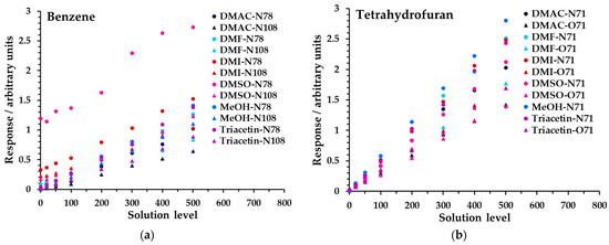 - Benzene (and isooctane): very solvent-dependent behavior (higher signal in more polar solvents) plus similar behavior to (3) with triacetin. For benzene specifically, DMSO is not ideal as a solvent, due to DMSO interference [13] (see also Figure 4).