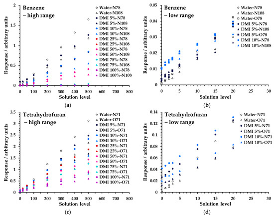 Linearity of SIFT-MS response for (a) benzene in the high range, (b) benzene in the low range, (c) tetrahydrofuran in the high range, and (d) tetrahydrofuran in the low range at higher proportions of DMI in water for Mix 1 (Table 3). Measurements have not had the blank subtracted. The legend indicates the solvent and its proportion in water first, then the reagent ion (first letter), and finally the product ion m/z.