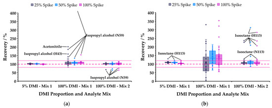 Box and whisker plots summarizing recovery of (a) polar and (b) non-polar analytes (see text) for various combinations of DMI proportion in water and spike levels of standard mixes. Dotted pink lines show general acceptance criteria (±20%); ions that fall outside criteria are annotated, except for non-polar compounds from Mix 1 in 100% DMI (the very low partitioning precludes practical recovery).