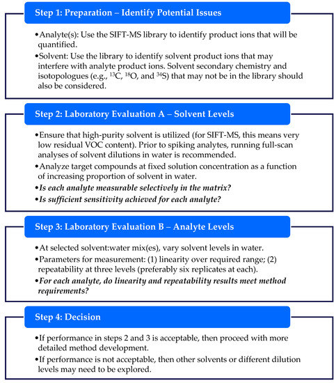 A summary workflow for evaluating diluent solvent–analyte compatibility with SIFT-MS. Untested diluents should be assessed using the criteria in Table 8 before starting this workflow.