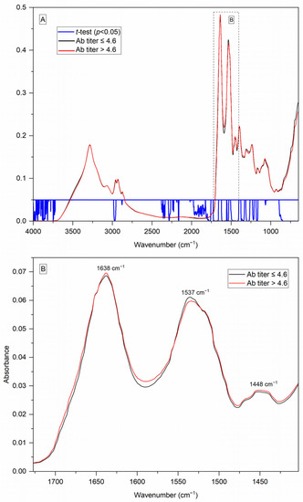 Antibody titers were transformed by the expression log2 (1/Antibody titer), obtaining inverse powers of 2, as described in Table 1. The average serum spectra were presented in two sets to analyze differences between samples with higher antibody titers and those with lower titers. Considering the mean value of the titers in log2 (1/Antibody titer), which was 4.6, one of the sets grouped the samples with values of titers less than or equal to 4.6 (n = 64), and the other grouped the samples with titer values greater than 4.6 (n = 54). Averaging was obtained by calculating the arithmetic mean of absorption for each frequency of the three min–max and vector normalized spectra from each sample, followed by the arithmetic mean of all samples in the set. A t-test with a significance level of 0.05 was performed between the sets to determine their differences [20].