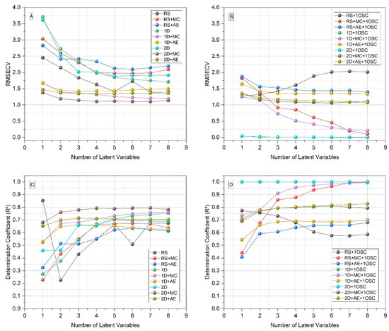 Figures of merit of PLS models for antibody titer prediction with different pre-processing methods, from one to eight latent variables, considering the total set of the samples (N = 118). (A) Root mean square error of cross-validation (RMSECV), without orthogonal signal correction (OSC); (B) RMSECV with OSC; (C) determination coefficient (R2) without OSC; (D) R2 with OSC. RS: raw spectra; MC: mean centering; AE: autoscaling; 1D: 1st derivative; 2D: 2nd derivative.
