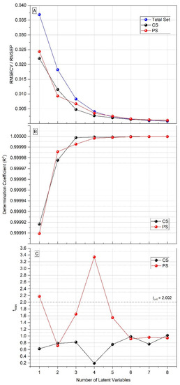Several studies have already used OSC in different techniques and analyses in order to improve the predictive quality of multivariate calibration models. In the field of medical mycology, our research group already successfully applied OSC to identify fungi that cause chromoblastomycosis, using FTIR and PLS-DA [26], and for predicting the antifungal susceptibility of Fonsecaea pedrosoi isolates against itraconazole, using FTIR and PLS [27]. In the same way, in the present work, we were able to optimize the results with the use of one OSC component, together with the use of first derivative. Although the figures of merit were very similar with the use of first or second derivative and one OSC component (they are even superimposed in Figure 2B,D), the values were slightly better with the first derivative. From the definition of the best conditions, the samples were divided 1:1 in the calibration and prediction sets and the modeling was carried out. Under these conditions, the models with one to eight latent variables showed determination coefficients and root mean square errors compatible with high performance (Figure 3).