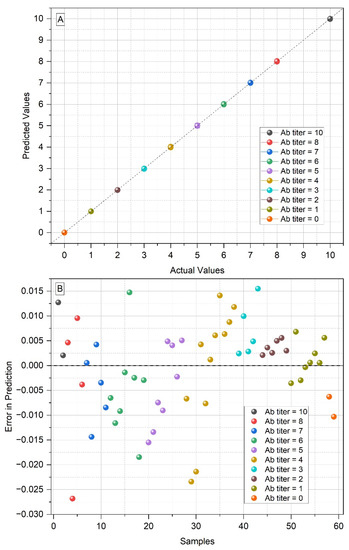 (A) Predicted values vs. actual values of the antibody titers from the serum samples of patients with paracoccidioidomycosis, in the PLS prediction set with two latent variables (the points representing the samples are overlapped); (B) errors in predicted values for each serum sample, in the PLS prediction set with two latent variables.