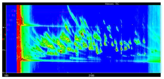 These substances give fermented alcoholic beverages a fruity, herbal, floral, or off-flavor []. Extraction methods and gas chromatography coupled with detectors are the traditional methods for detecting and identifying VOCs []. In order to obtain an accurate VOC profile of beverages and to best identify each VOC, an instrument with a higher separation capacity is required. Comprehensive two-dimensional gas chromatography coupled with mass spectrometry (GC×GC-MS) is a promising solution [,]. To obtain good results for GC×GC-MS VOC analysis, researchers need to optimize sample extraction, GC×GC separation, and data processing.