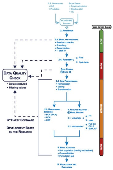 General data processing workflow for GC×GC-MS data and the user input impact for each step. As quoted from a previous review [], reproduction is allowed according to STM Permissions Guidelines. Abbreviations: design of experiment (DoE), quality control (QC), identification (ID), robust principal components analysis (rPCA), hierarchical cluster analysis (HCA), unsupervised random forest (URF), fisher ratio (FR), partial least squares discriminant analysis (PLS-DA), orthogonal partial least squares (OPLS), support vector machines (SVM), random forest (RF).