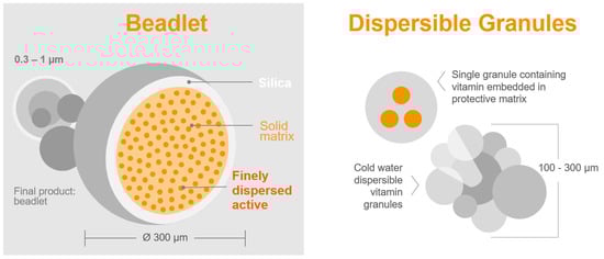 - Source of vitamin A: The susceptibility of various sources or commercial products of vitamin A to degradation can vary significantly due to differences in their formulation [94] (Figure 2). Factors such as light, oxygen, temperature, and moisture play crucial roles in the degradation process. Consequently, these variations can potentially influence the analytical outcomes, even if the initial activity of multiple vitamin A sources in an identical premix composition is similar. Furthermore, repeatability in retinol analysis is influenced by the physical properties of the vitamin A source (beadlet) utilized during the production of the premix or feed [8]. It is inversely correlated with the concentration of vitamin A present in the sample.